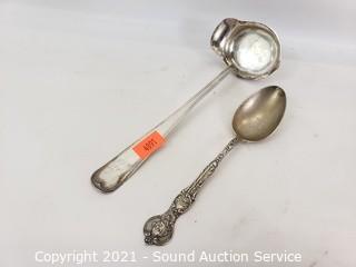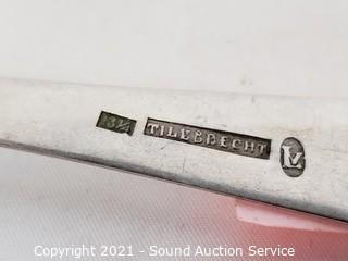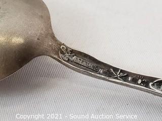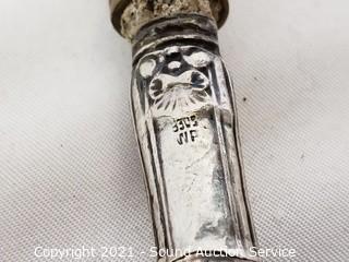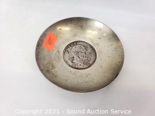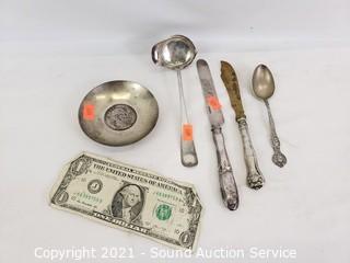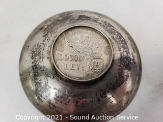 Lot Details: Dish bottom is Romania 100,000 Lei coin. Blade on one of the knives is also silver. TW: without non-sterling bladed knife, 4.6oz.