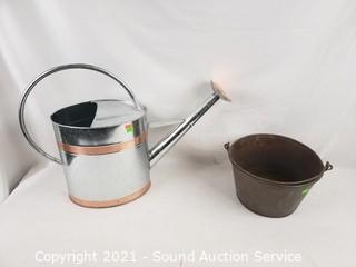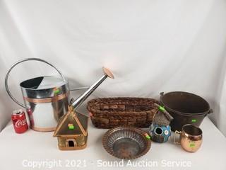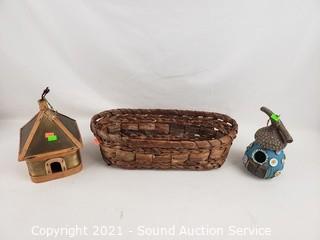 Lot Details: Metal bucket, drip pan, woven basket, bird houses.