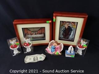 Lot Details: Quartz Decorative Mantel & Picture Frame Clocks, 7pc Religious Decor, Hand Painted Vinyl Motorcycle & Skeleton Figures.