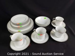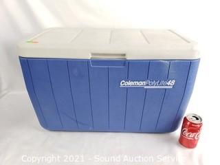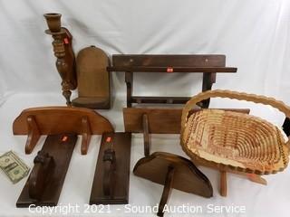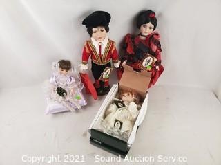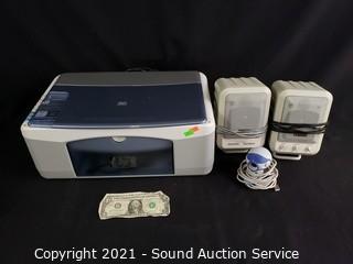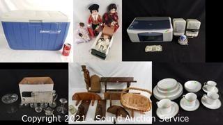 Lot Details: Wood Shelf, Candleholders Basket & Other Decor, 4 Geppeddo Collectible Porcelain Dolls, Assorted Clear Glass& Crystalware, Coleman Polylite 48 Cooler, 6pc Service for 4 Simplicity Fine China, HP All-in-One Printer, Reveal PC Speakers, Webcam.