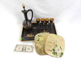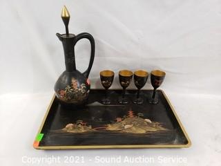 Lot #0181: Vtg. Asian Wood Decanter, Cordial & Tray Set