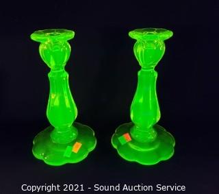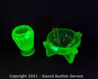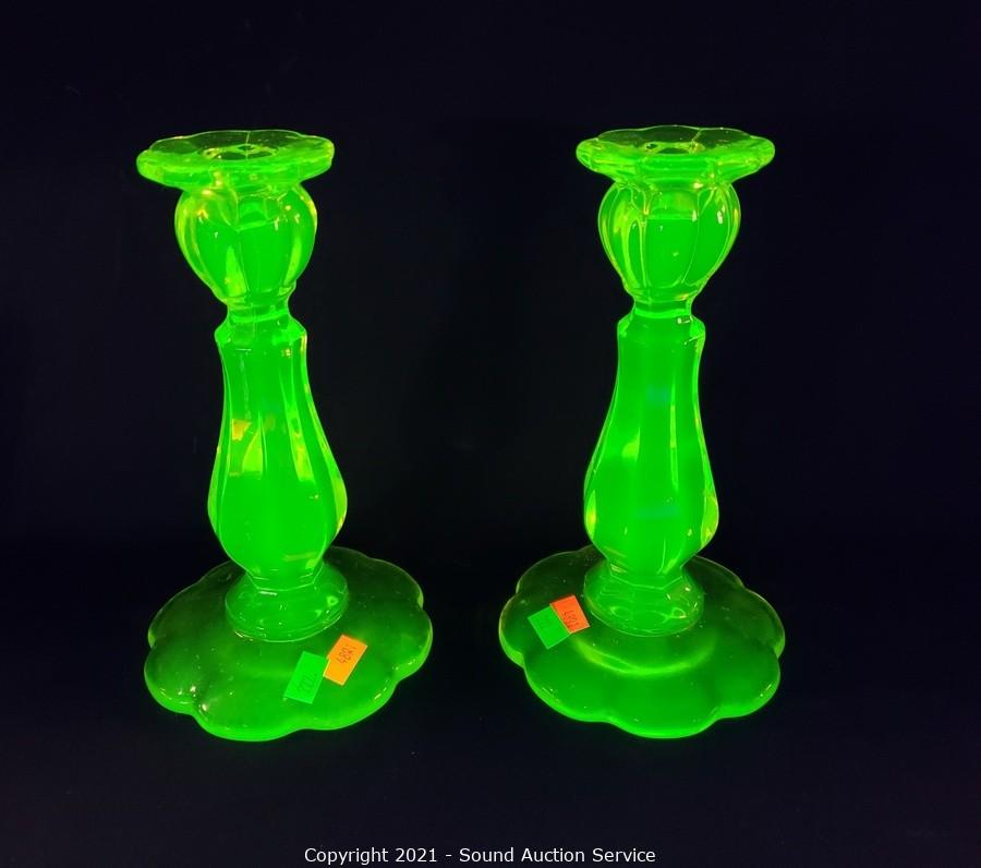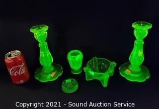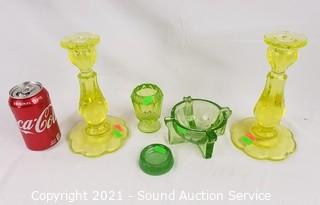 Lot Details: 2 candle holders, small vase, votive and ash tray.