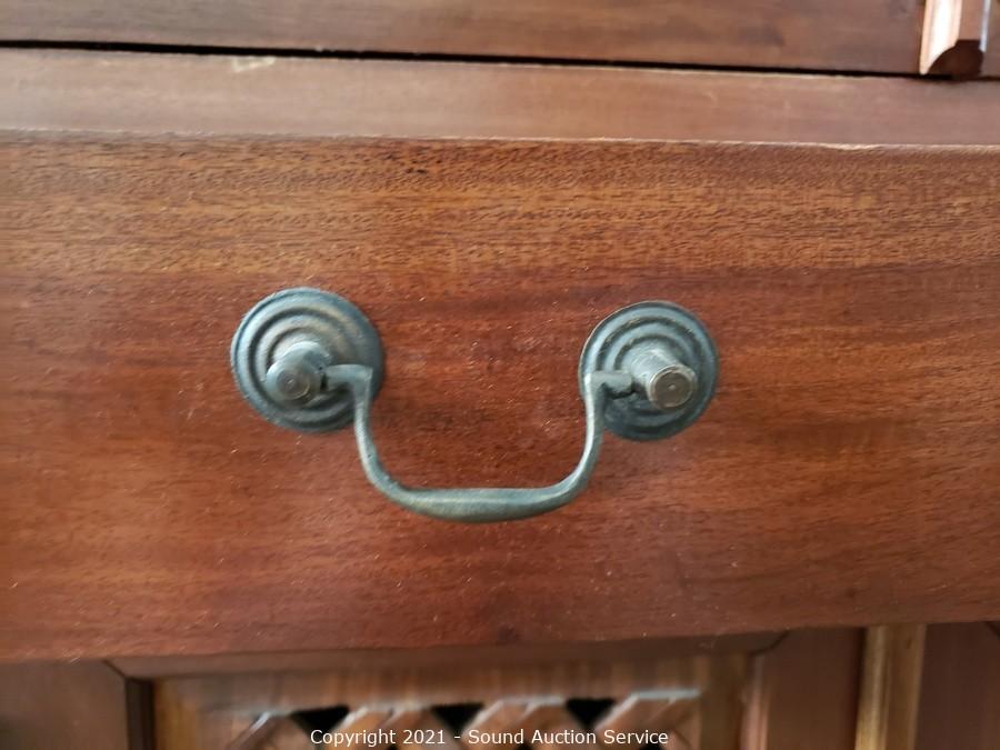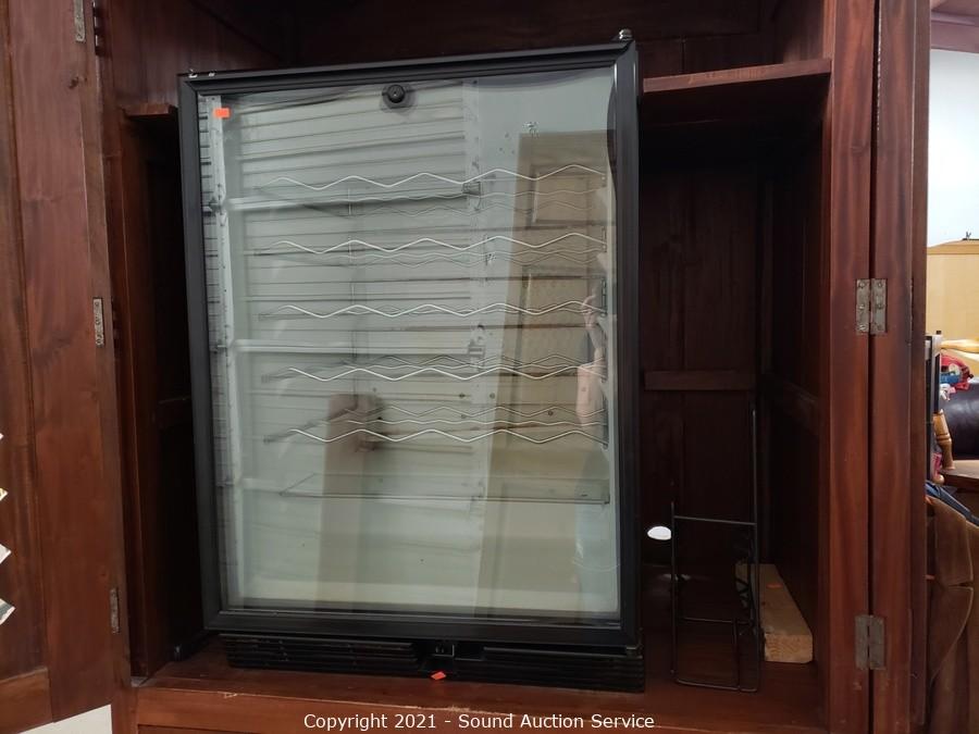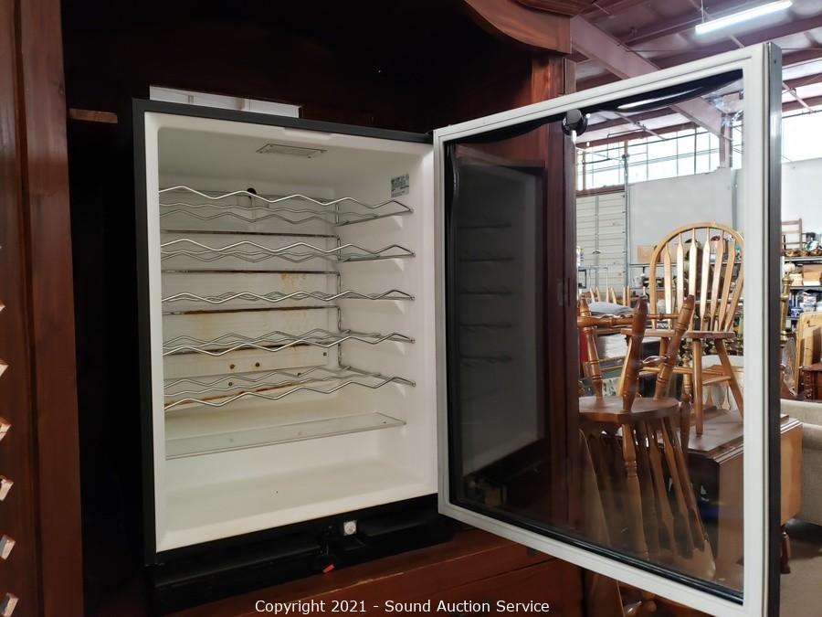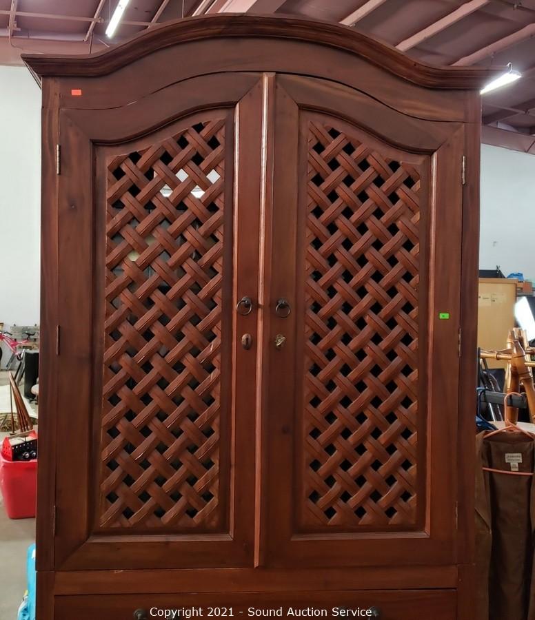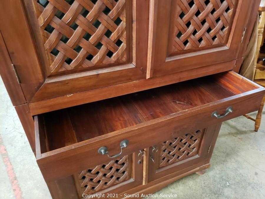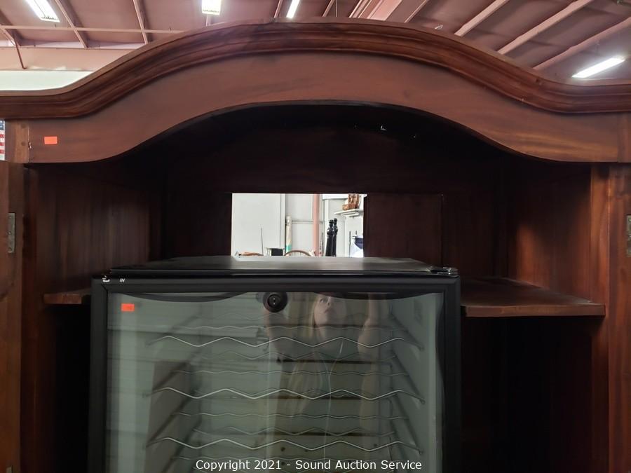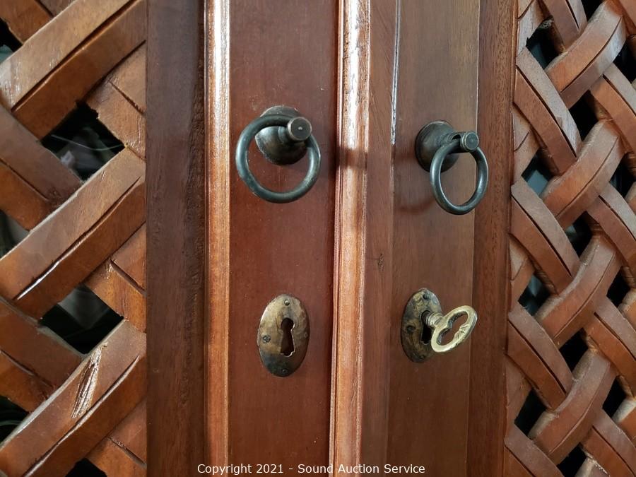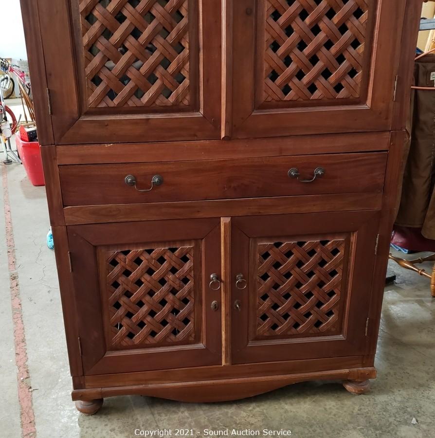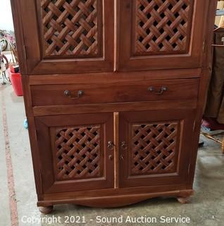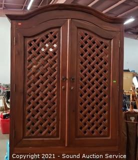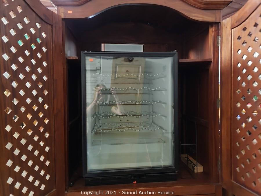 Lot Details: Chiller holds 20 bottles of wine, works. Overall Cabinet look all hand crafted & carved, hand carved trim & lattice doors. Overall 84.5" H x 40" W x 26" D.