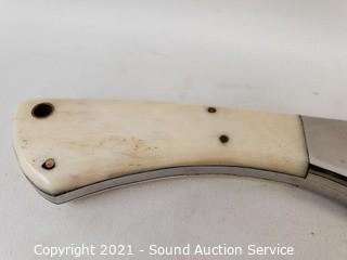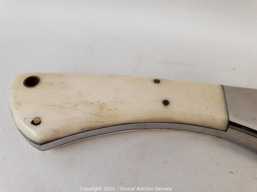 Lot Details: Handle looks like it could be bone? Unsure as it is glazed with something. 9" long overall, 4.75" long blade. Tip has a little bit of rust on it.