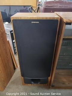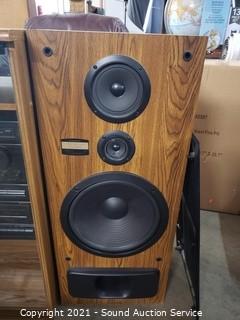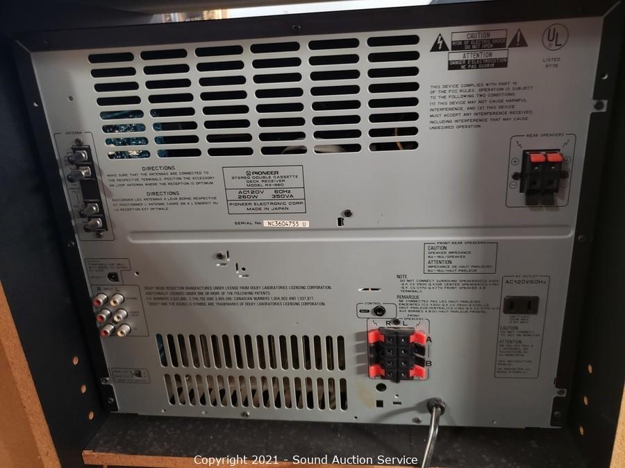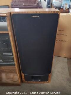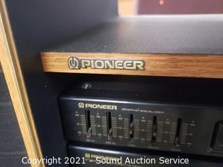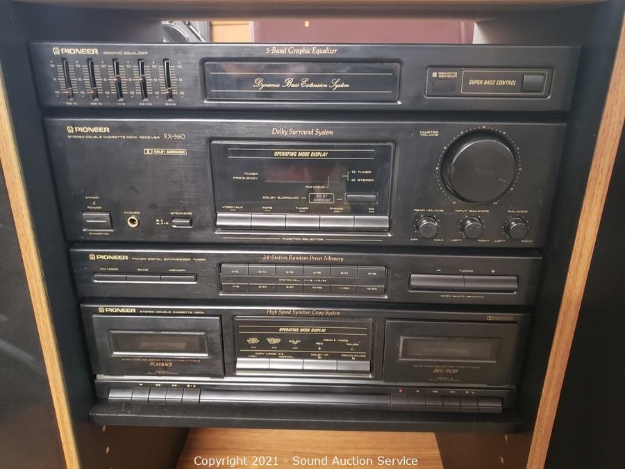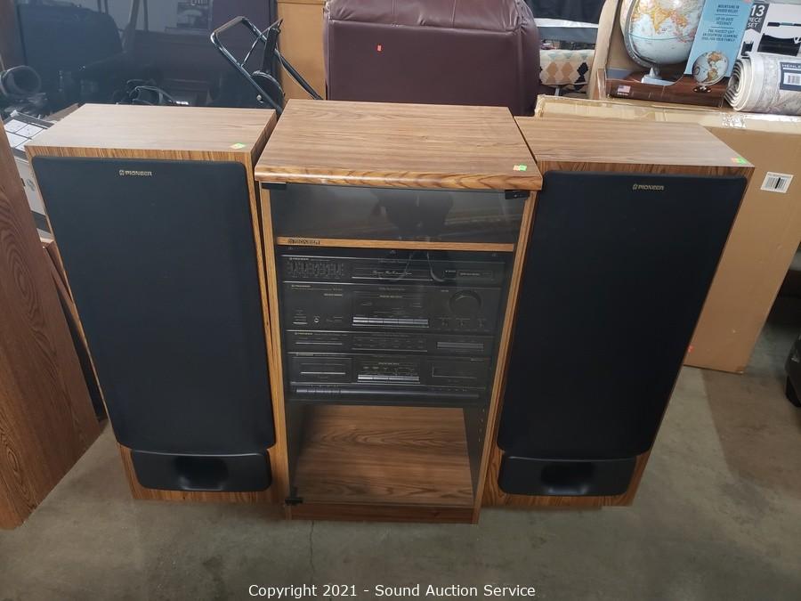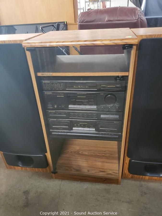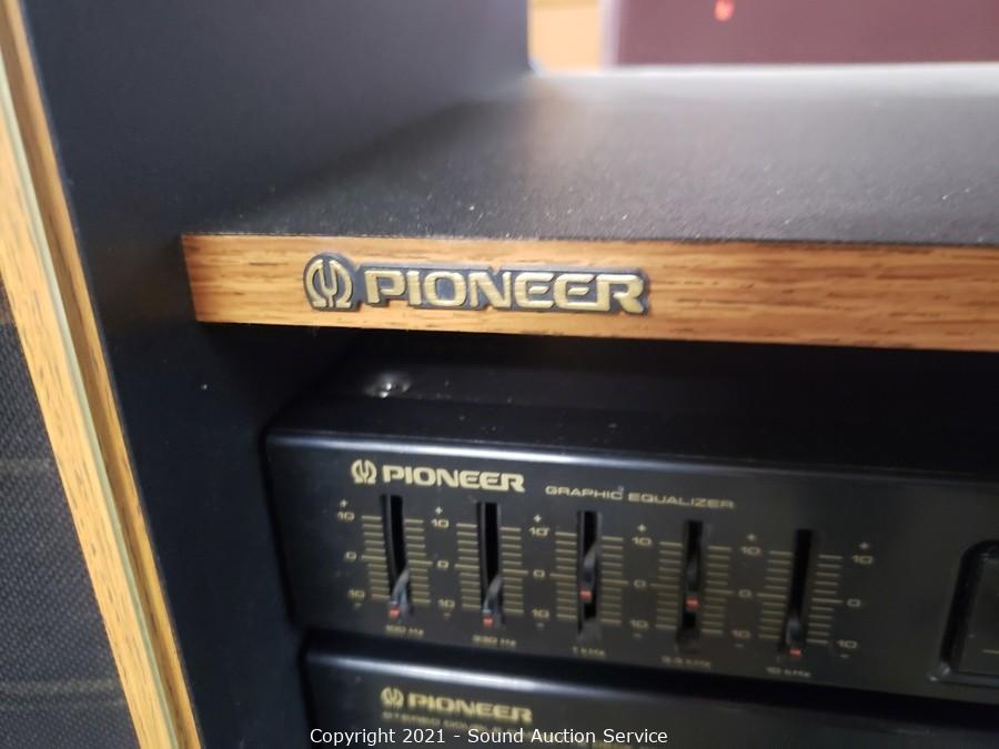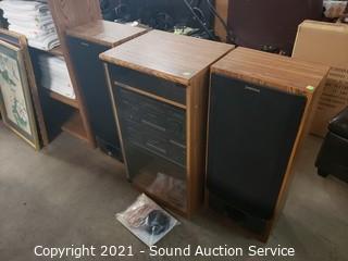 Lot Details: Equalizer, Receiver, Cassette, Tuner, Speakers & Cabinet. Tape deck not working, tested with aux, works, turner has no antenna. 36" H x 18.5" W x 15.5" D cabinet. 36" H x 15" W x 10" D speakers.