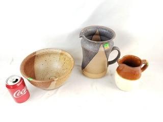 Lot #0153: Signed Pottery Bowl & 2 Pitchers