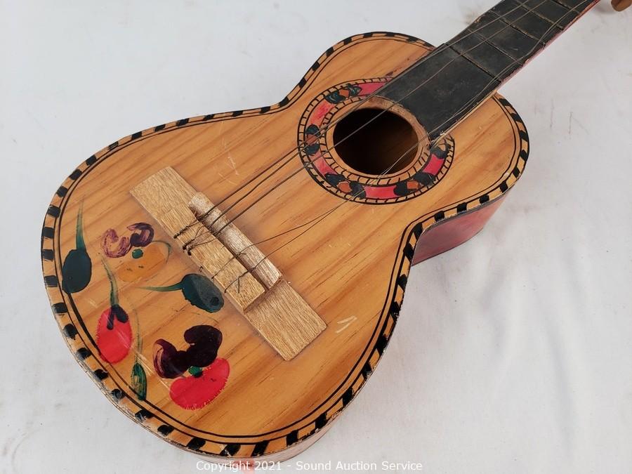Lot Details: Various wear to the finish. Do not see a brand, appears to be hand made. Missing a couple pegs and strings. Hand painted and stained. 22.5" long overall, 10.25" x 7.25" x 2.25" body.