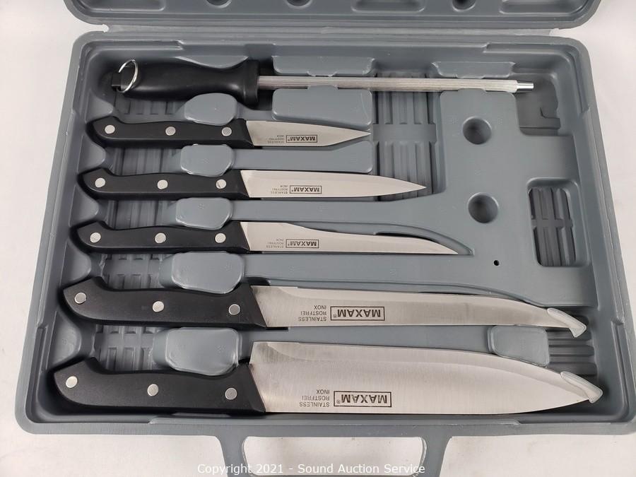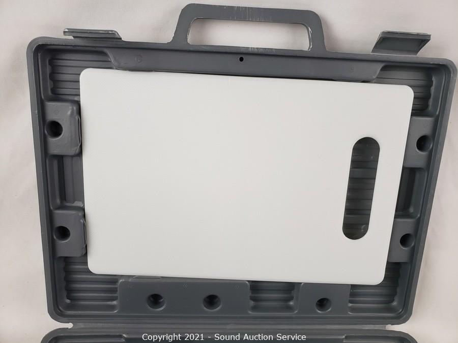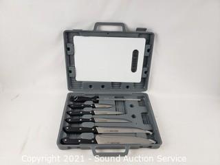 Lot Details: Set includes chef's knife, slicer, boning knife, utility knife, paring knife, sharpening steel, cutting board and storage case. Like new.