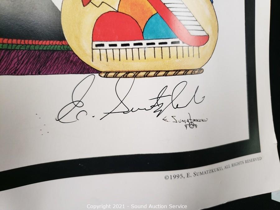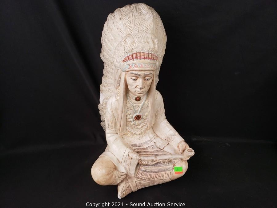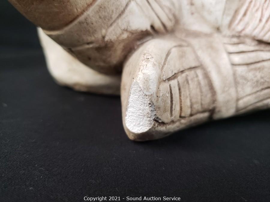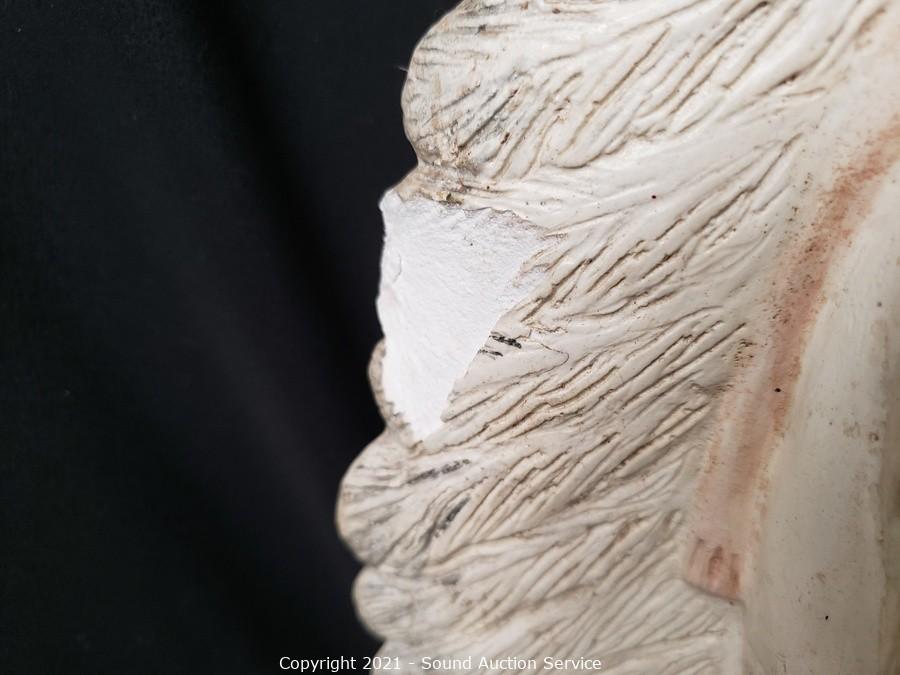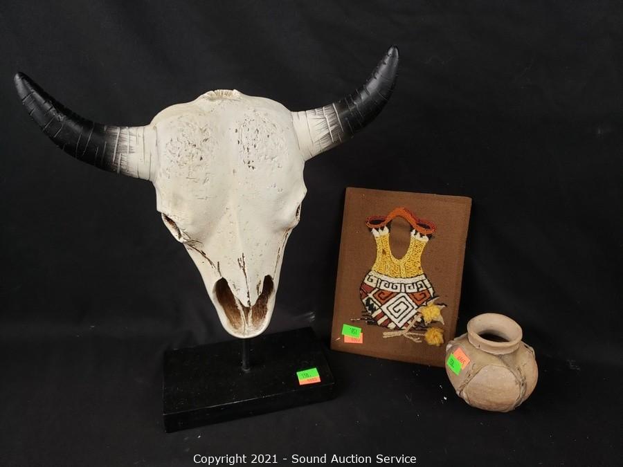Lot Details: Chalk statuary (a few chips) 17" x 10", bull skull statuary13" x 10", pottery vessel 3.5" x 3.5", embroidery & print artwork 5" x 7" & 16" x 24".