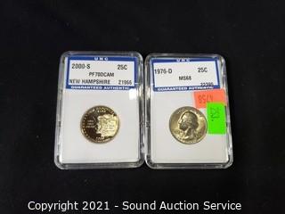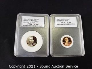 Lot Details: 2006-S Jefferson Nickel "Return to Monticello" FDI PR70 DCAM; 2006-S Lincoln Penny FDI PR70 DCAM; 1981-P Nickel MS70; 1996-S Quarter PR70CAM; 2000-S New Hampshire Quarter PF70DCAM; 1976-D Quarter MS68; 2006-D "Return to Monticello" Nickel MS70STN.