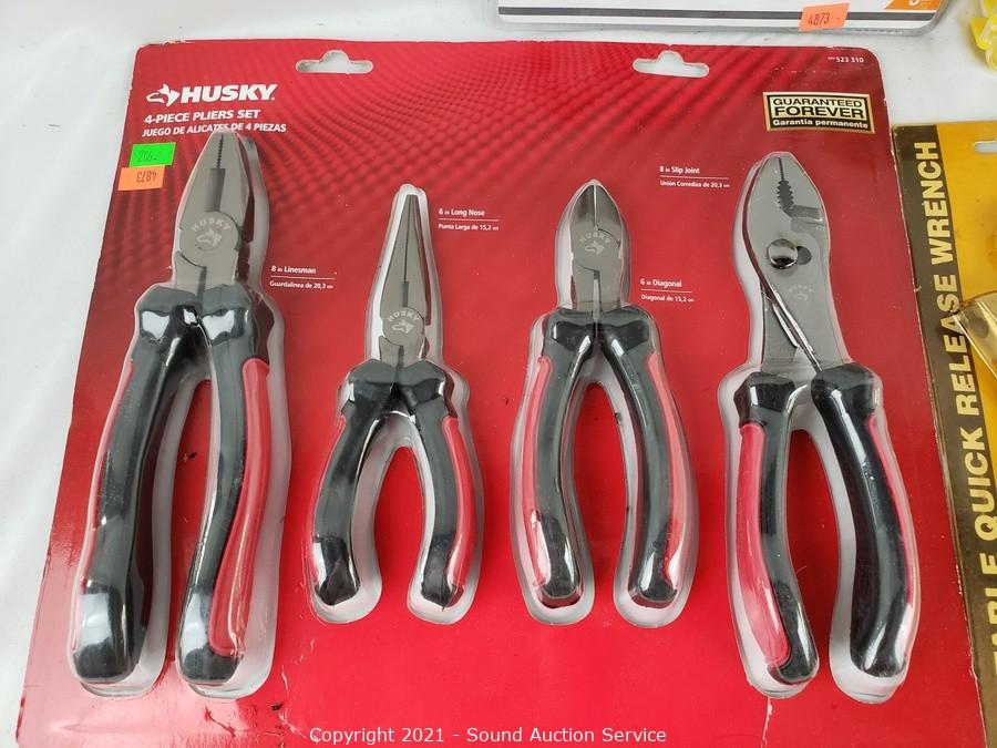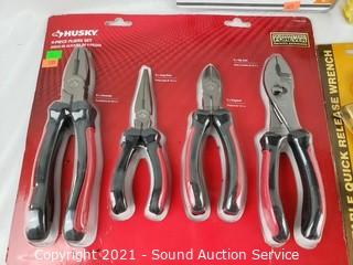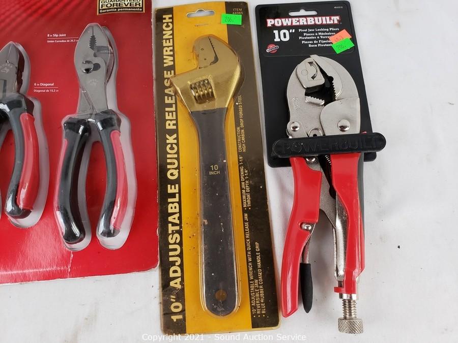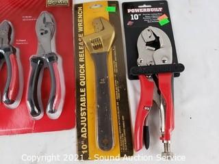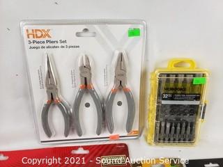 Lot Details: All sealed in original packaging. HDX 3pc Plier Set, WorkForce 32pc Bit Driver Set, 10" Adjustable Quick Wrench, Powerbuilt 10" Locking Pliers, Husky 4pc Pliers Set.