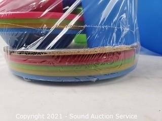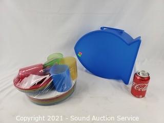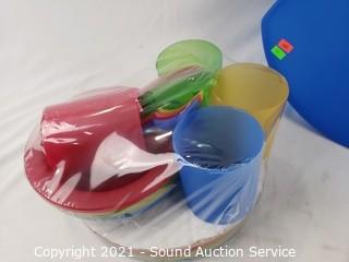 Lot Details: Includes 4 cups, 4 saucers, 4 plates and utensils. Sealed in plastic. Case has some scuffs.
