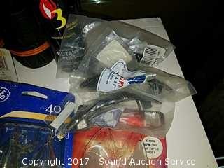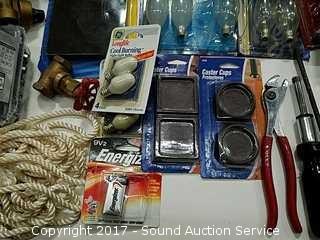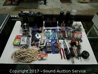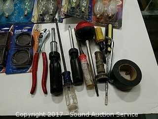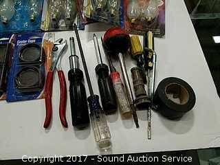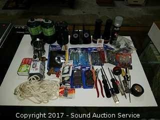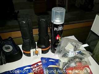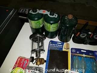 Includes A Single Mantle Coleman Propane Lantern W/3 Propane Tanks 2 Look New, A Bunch Of New In Package Lightbulbs, Cobra Walkies With Dock, Matches, Various Tools Electrical Tape And Butane.