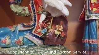 A/S with maker's marks in chinese. Hand painted, hand sculpted, incredibly fine detail. Comes with original packaging. Appears to be new, we removed them from the box. Approx. 7.5" tall and 11" tall. Includes: "Chinese Lady with Crane" and "Chinese Lady Leaning on Table".