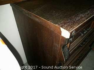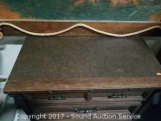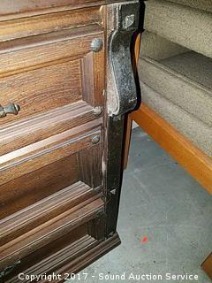 The Front is overlaid in riveted wrought iron strips, with a leather inlaid top. Each upper corner is missing a piece of the veneer. Approx. 29-1/2" tall, 30" wide & 18-1/2" deep.