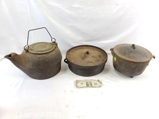 Lot #0119: 3pc Vtg. Rustic Cast Iron Cookware