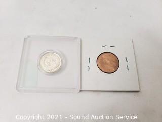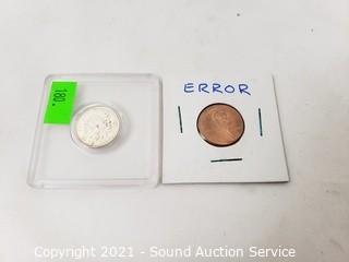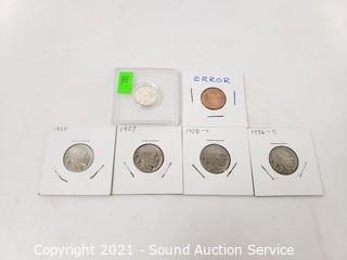 Lot Details: 1896 Indian Silver? Head Cent, unsure of the composition, silver tone, in excellent mint or near mint condition. 4 buffalo nickels 1920, 1927, 1928-S, 1936-D & 2005 Error strike Lincoln cent.