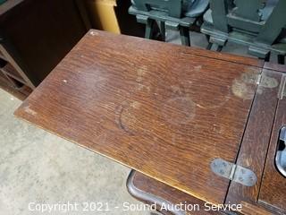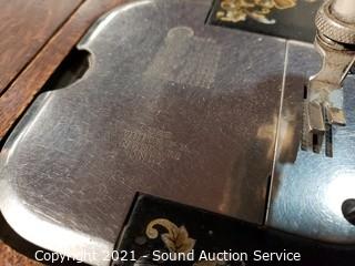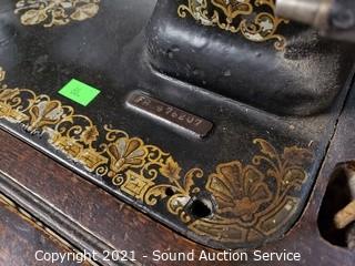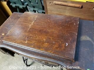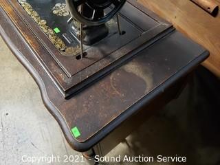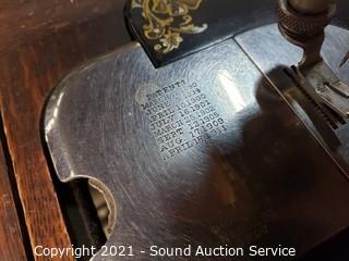 Lot Details: Serial FR476207, last patent date April 18, 1911. Needs a new belt but appears to be in working condition. Comes with accessories in the top drawer of the cabinet. 29" x 34" x 17", some wear to the finish.