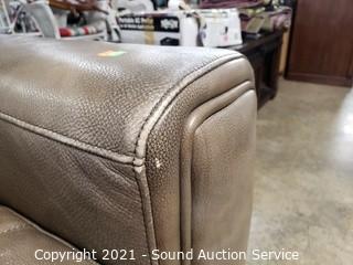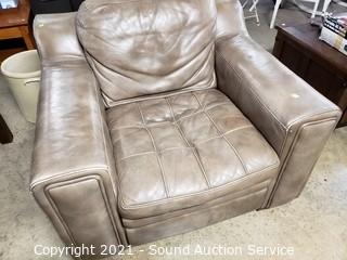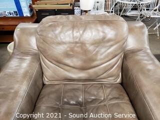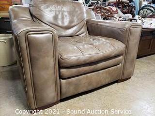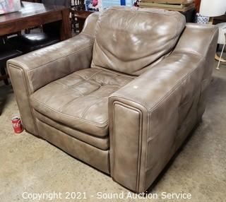 Lot Details: Some minor wear to the leather, has a scratch on right arm rest, overall great condition. 32" x 44" x 38", 18" to seat.