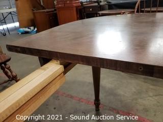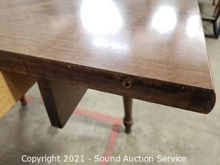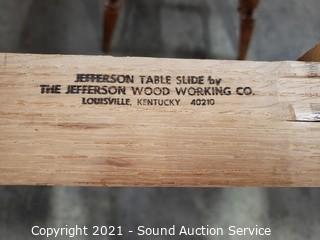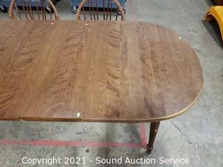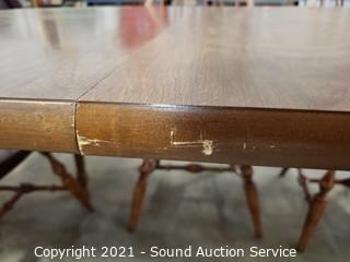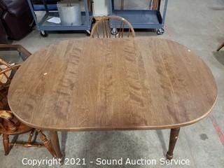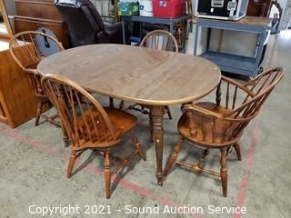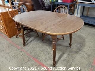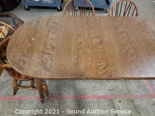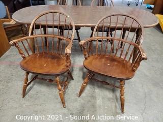 Lot Details: 2 are captains chairs, 30" H x 56" x 38" table with (2) 12" leaves. Missing pegs on one of the leaf.