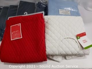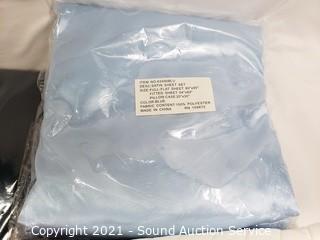 Lot #0348: 7 Blue Tablecloths, 3pc Sheet Set & 2 Tree Skirts