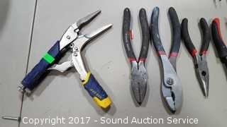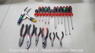 Includes: Task force screwdrivers, comes with a wall mount. Flat head pliers, needle nose plyers, and more. Also comes with Irwin needle nose vice grips.