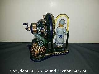 Solid cast iron construction, in good working condition, Wind up push the button and she starts skipping rope. Approx. 10" tall, 8-1/2" x 9" x 4-1/2". Comes with box and paperwork, by Hawthorne Direct LLC.