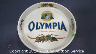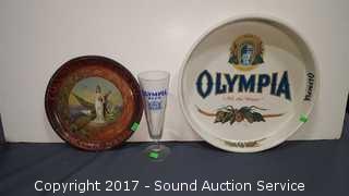 Lot #0142: Olympia Beer Tin Tray, Plate & Wine Glass