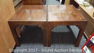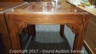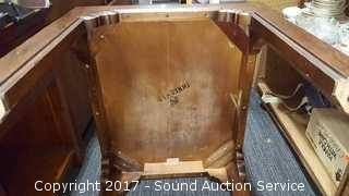 Dark stained oak. Approx. 22" tall, 27" x 22".