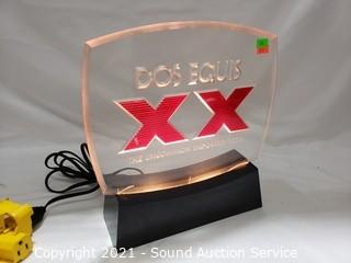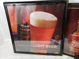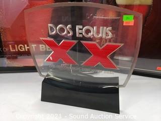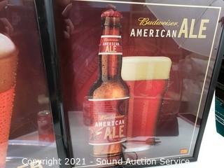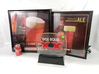 Lot Details: Dos Equis has cracks near base, works, 11" x 11". Budweiser works needs a new bulb, 18" x 18". Michelob has cosmetic frame damage, works but needs a new bulb. 19" x 19".