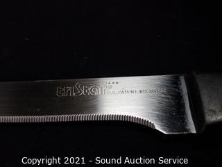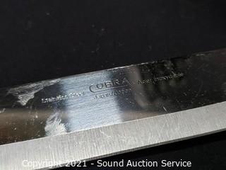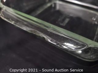Lot Details: Delco steak knives & other knives. 2-1/4" x 8" x 8" baking dishes. One square Pyrex dish has some chips on the handle.