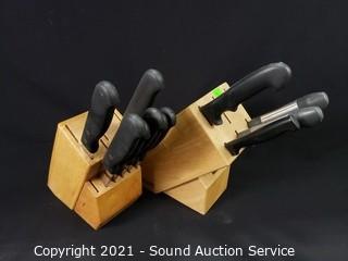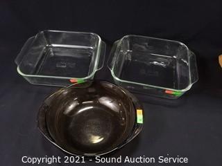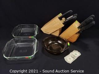 Lot #0080: 3pc Pyrex Cookware & Various Cutlery w/Blocks