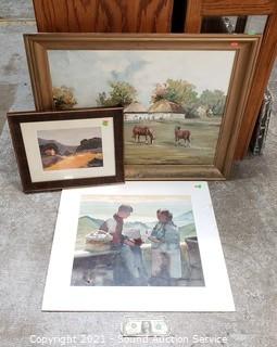 Lot Details: A.Johnson Litho 14" x 16", Loraine Philips Watercolor 24" x 22" & Lizut Equestrian Farm Oil Painting 24" x 30".