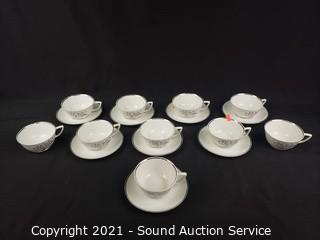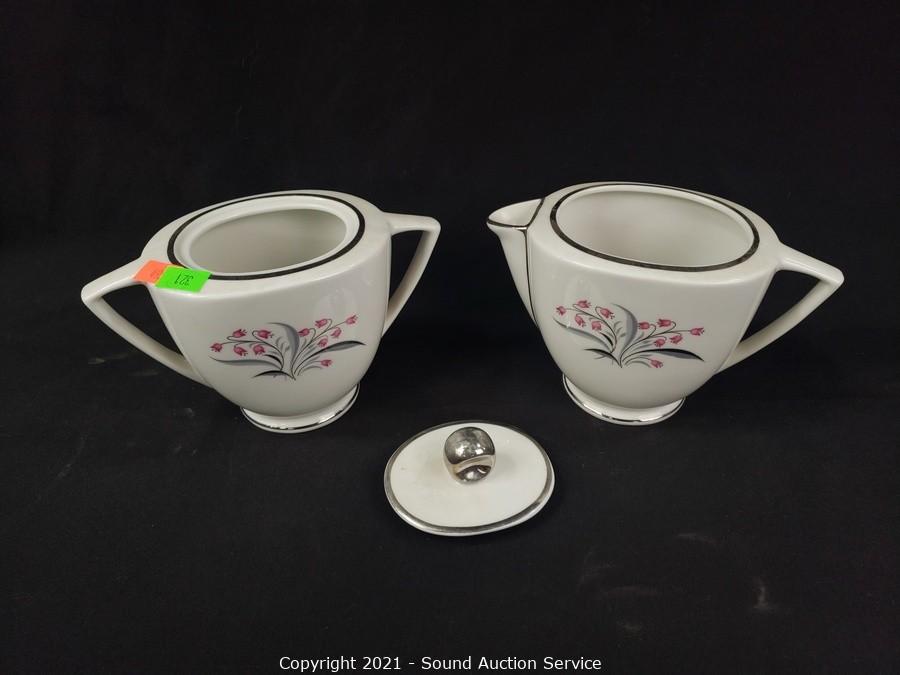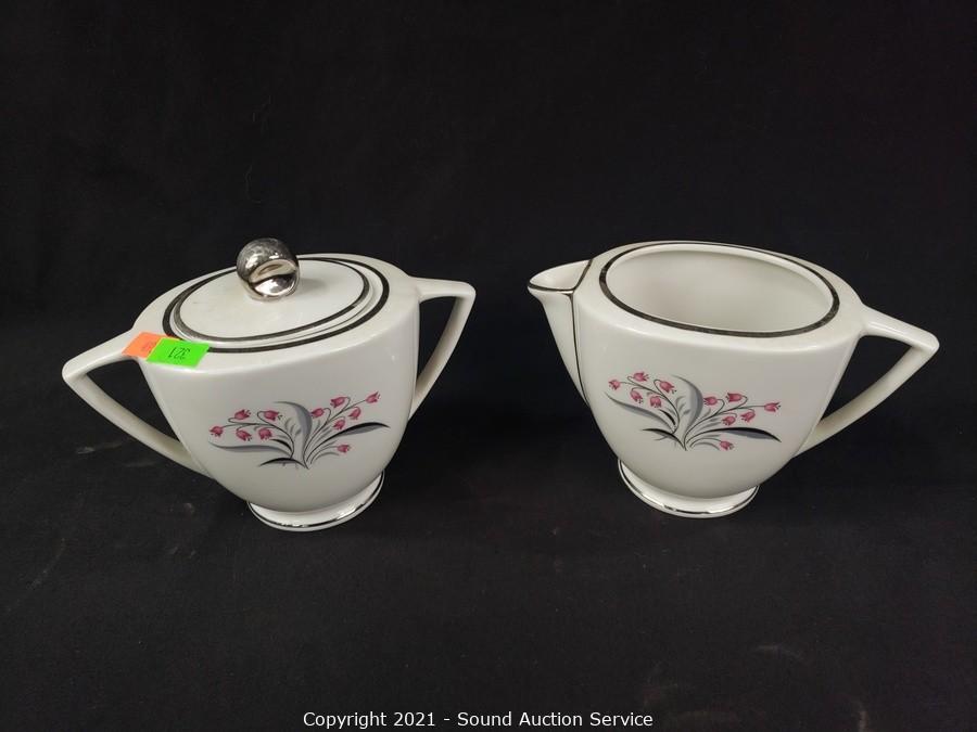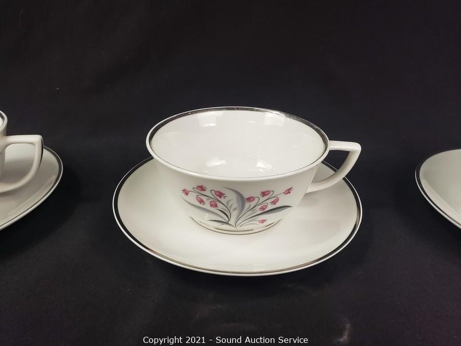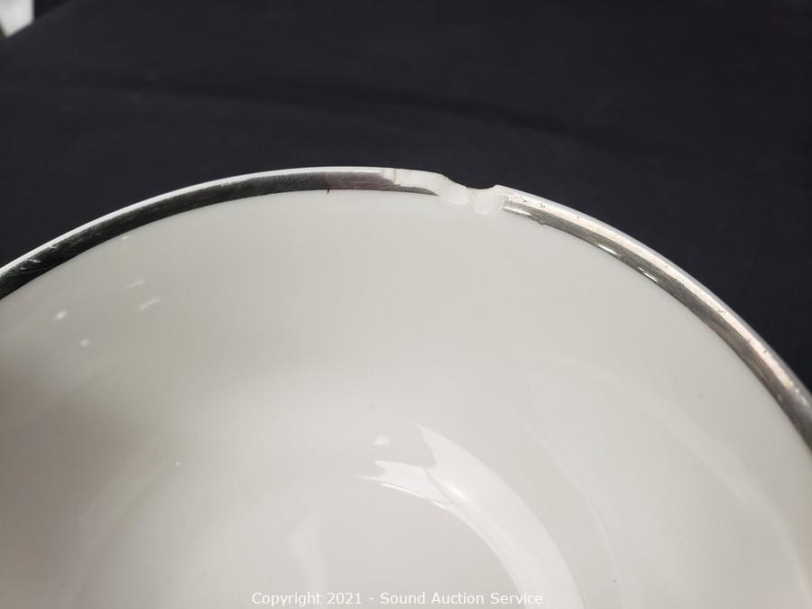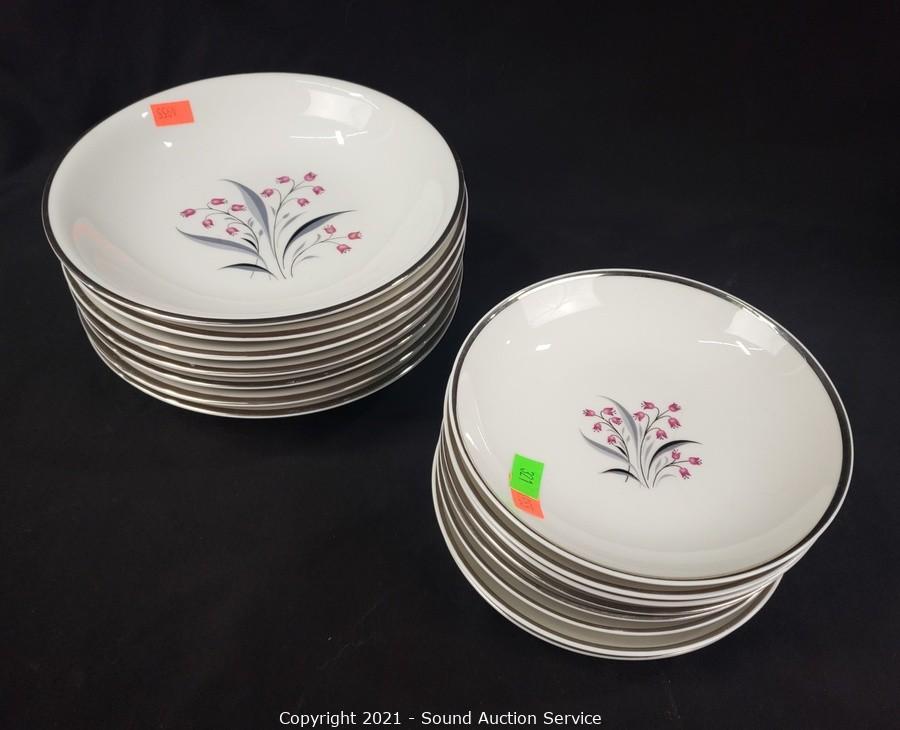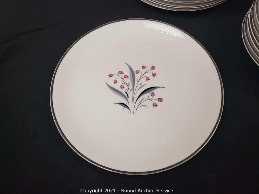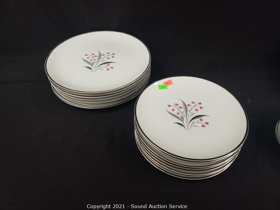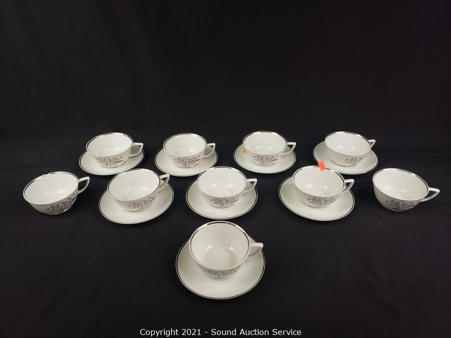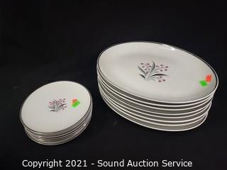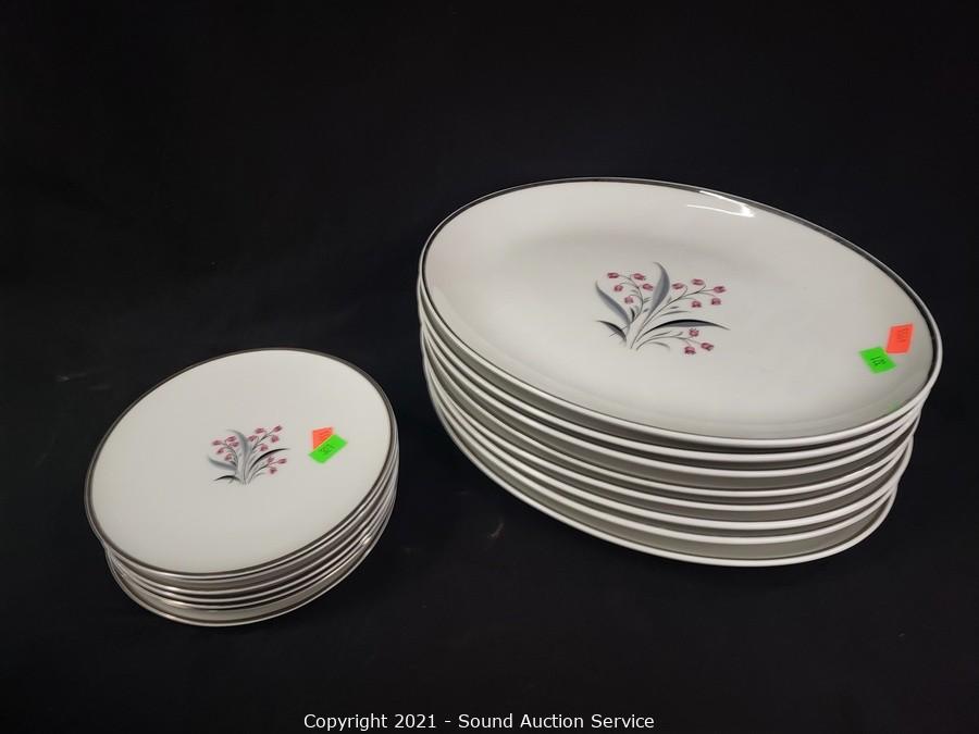 Lot Details: 10 cups, cream, sugar, 8 saucers, 8 berry bowls, 7 bowls, 7 snack plates, 8 lunch plates, 7 dinner plates, 8 oval 12" plates/platters.