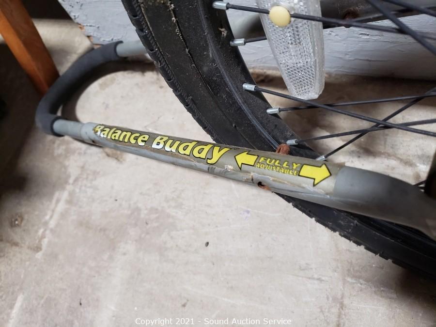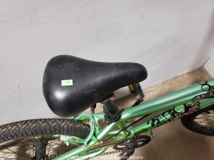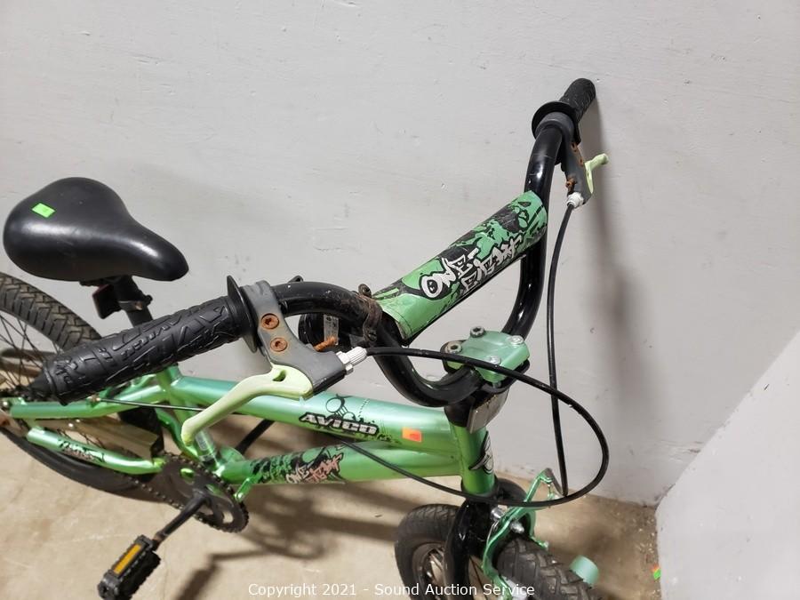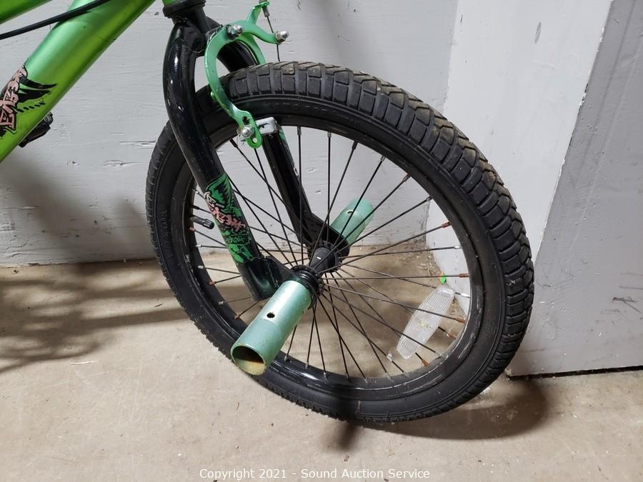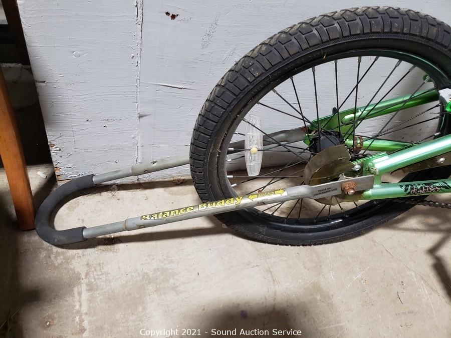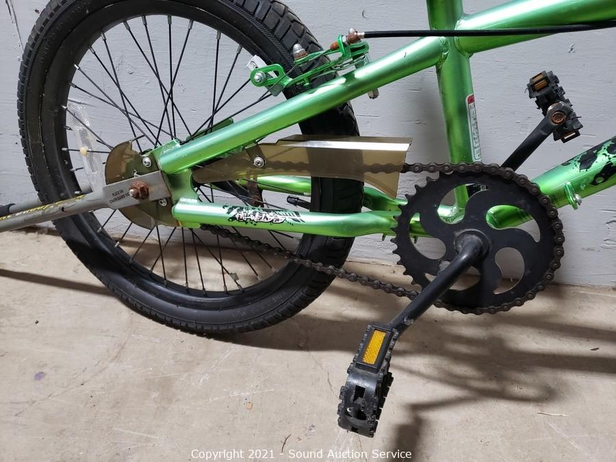 Lot Details: Pegs, front & rear grip brakes, bell. Some wear to the finish. Appears to be in functioning condition. 18" Wheels, 10" center post, 18" cross bar.