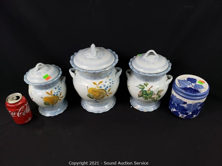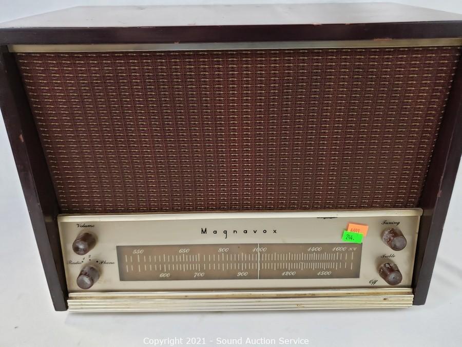 Lot Details: Vintage Magnavox Tube Radio - Model AM12. Works but tuner is not functioning. 2 Ruddell Youth Football Helmets S:Medium, Assorted Avon Cologne/Perfume Bottles, 4pc Capriware Hand Painted Canister Set.