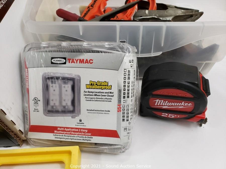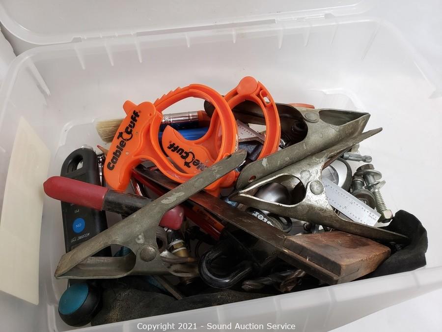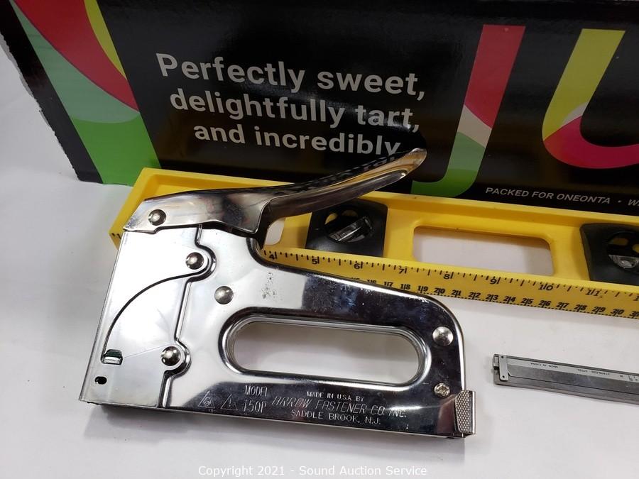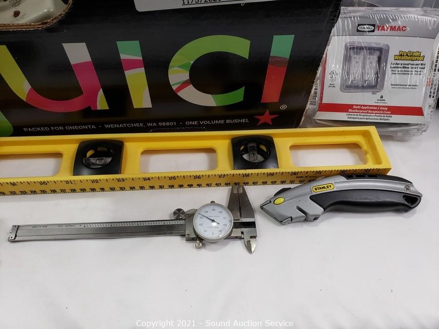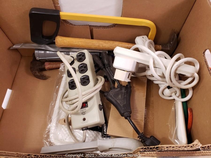 Lot Details: Power strips, hammer, level, hacksaw, staple gun, tape measure, caliper, & more.