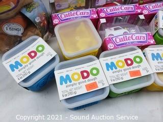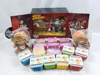 Lot Details: Skybound Super Dinosaur action figure, Shopkins Vehicles, Modo play Dough, Singing Monsters.