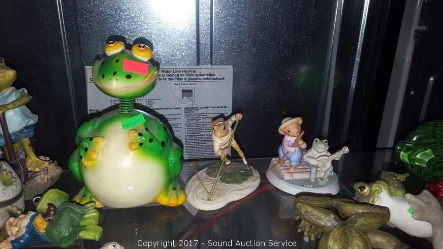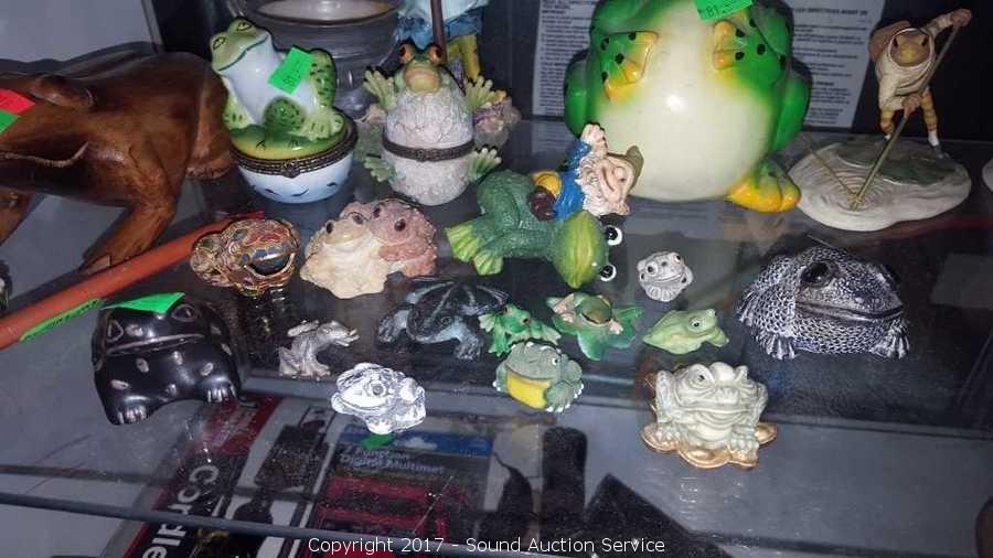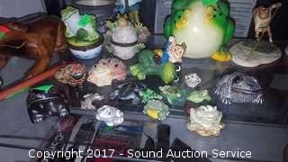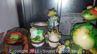 Includes: trinket boxes, bobblehead, percussion frog, planter decor, hand crafted frogs and more. Approx. 30 pieces.