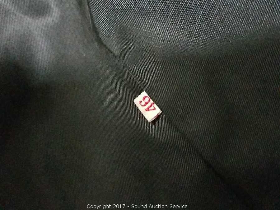 No tags, just a serial number. Has elastic wrists. Approx. 30" long, 18" shoulders, 16" underarm seam. Size 46 regular.