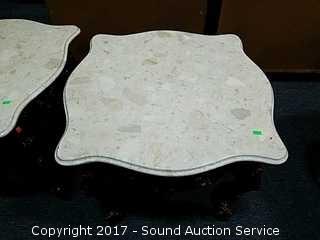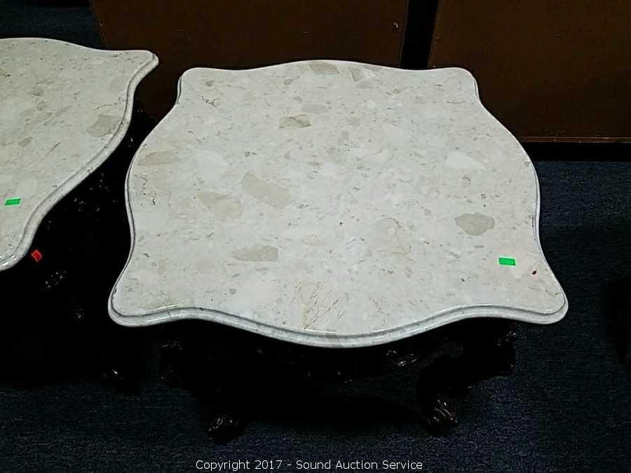 Elaborately carved base. Nice marble top. In excellent condition. Approx. 22" tall, 25.5" square.