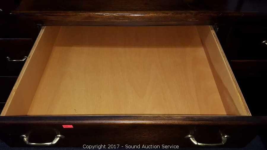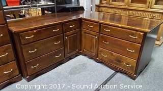 In excellent condition. Brass hardware. 8 drawers, 2 cabinets. Approx. 30" tall, 68" long both ways, and 25" deep.