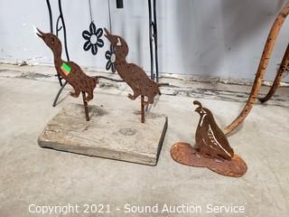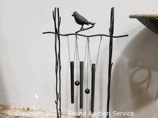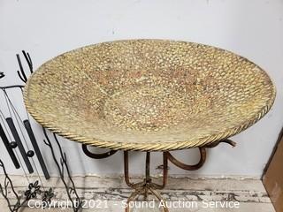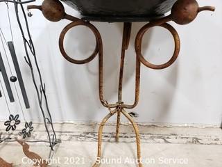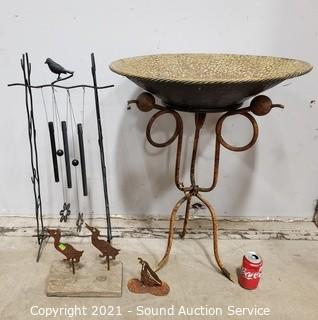 Lot #0301: Rustic Steel Bird Bath w/Metal Art Chime & Birds