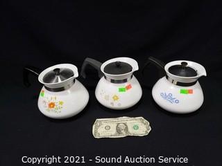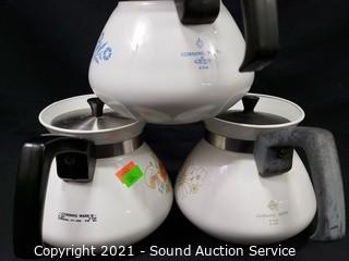 Lot #0397: 3 Corning Enamelware 6-Cup Tea Kettles