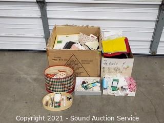 Lot Details: Sewing boxes, bias fold tape, scissors, needles, tape, various embroidery cloths, thread, various fabric & more.