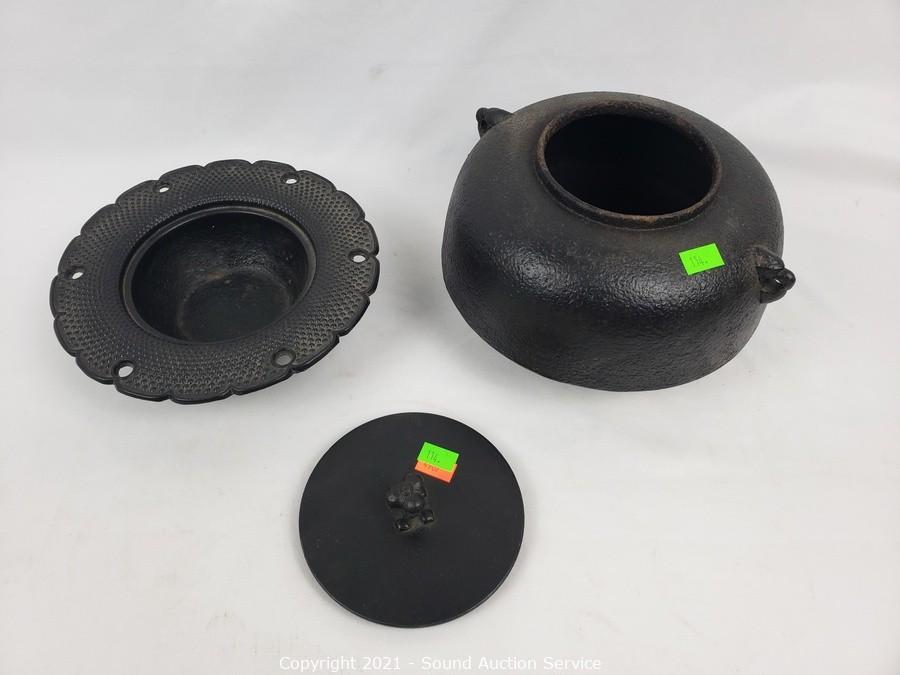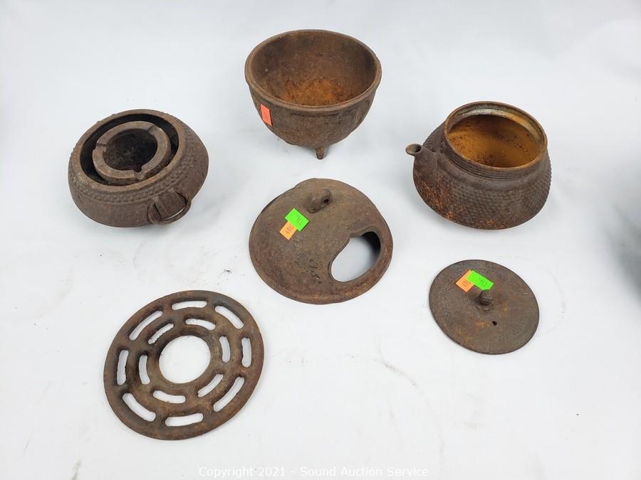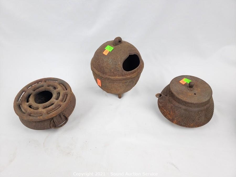 Lot #0114: Rustic Asian Cast Metal Pots, Kettle, Burner
