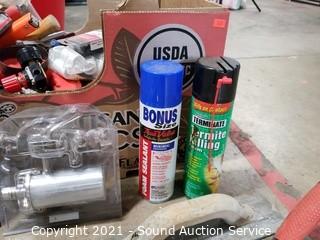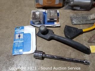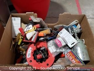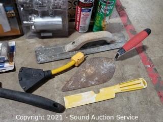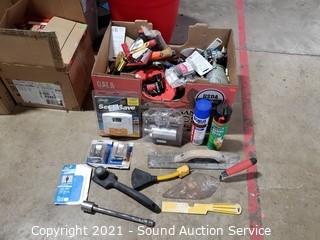 Lot Details: Pocket door locks, paint brushes, pneumatic paint spray guns, hammers, steel tape, floats & more.