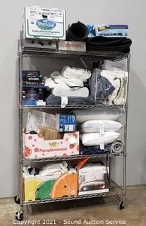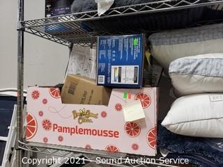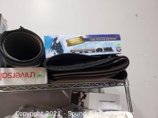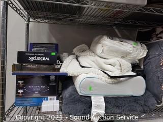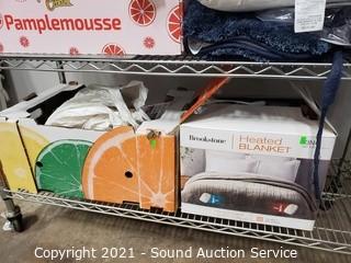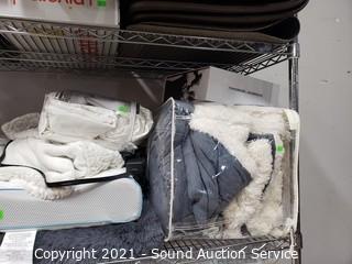 Lot Details: Pillows, blankets, security lights, rugs, mats, heated blankets, shower head, drone, train set 7 more. Cart NOT included.