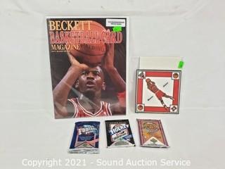 Lot Details: 1991 First Basketball Becket, Jordan 5x5 Felt Promo, 1991 Upper Deck Basketball, Hockey & Football Sealed card packs.