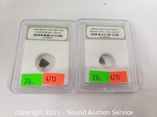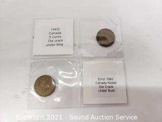 Lot Details: Constantine The Great Era Roman Empire c.330 AD coin bit & Roman Widows Mite Sized Bronze coin c.50 BC- 400 AD. (2) 1943 Canada Nickel Error Die Crack Under Bust coins.